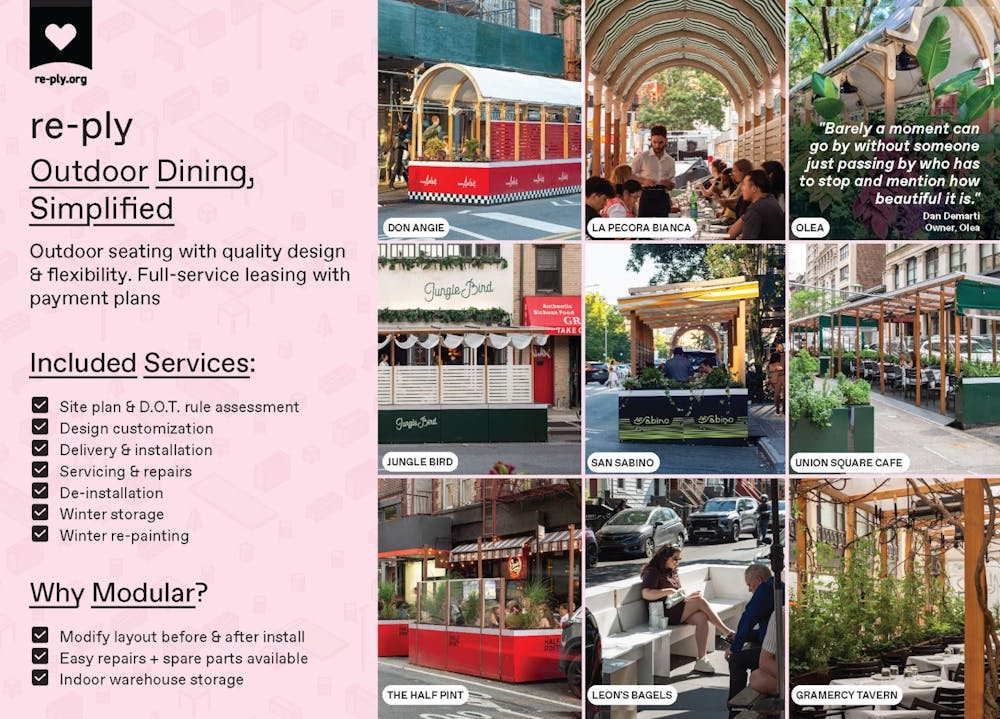 Since June 2020, re-ply has partnered with more than 80 New York City restaurants and restaurant groups to design and build beautiful, DOT-compliant outdoor dining spaces. Our architect-designed modular system is built specifically for the Dining Out NYC program, combining affordability, industry-leading flexibility, and full-service convenience.